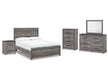 View full detailsAlluring smoky gray hues create an ambiance that just feels right. This bedroom package has a charming wood-like appeal enriched by a two-tone, tex...